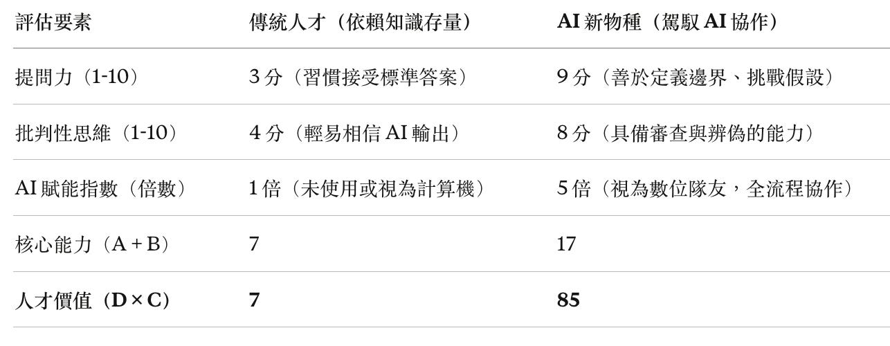 人才價值(產出)≈(提問力 + 批判性思維)× AI 賦能指數