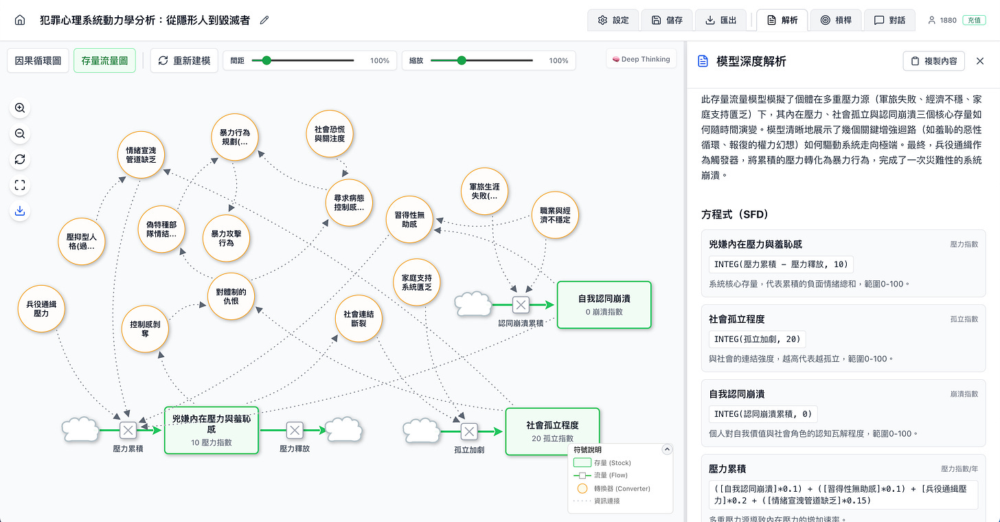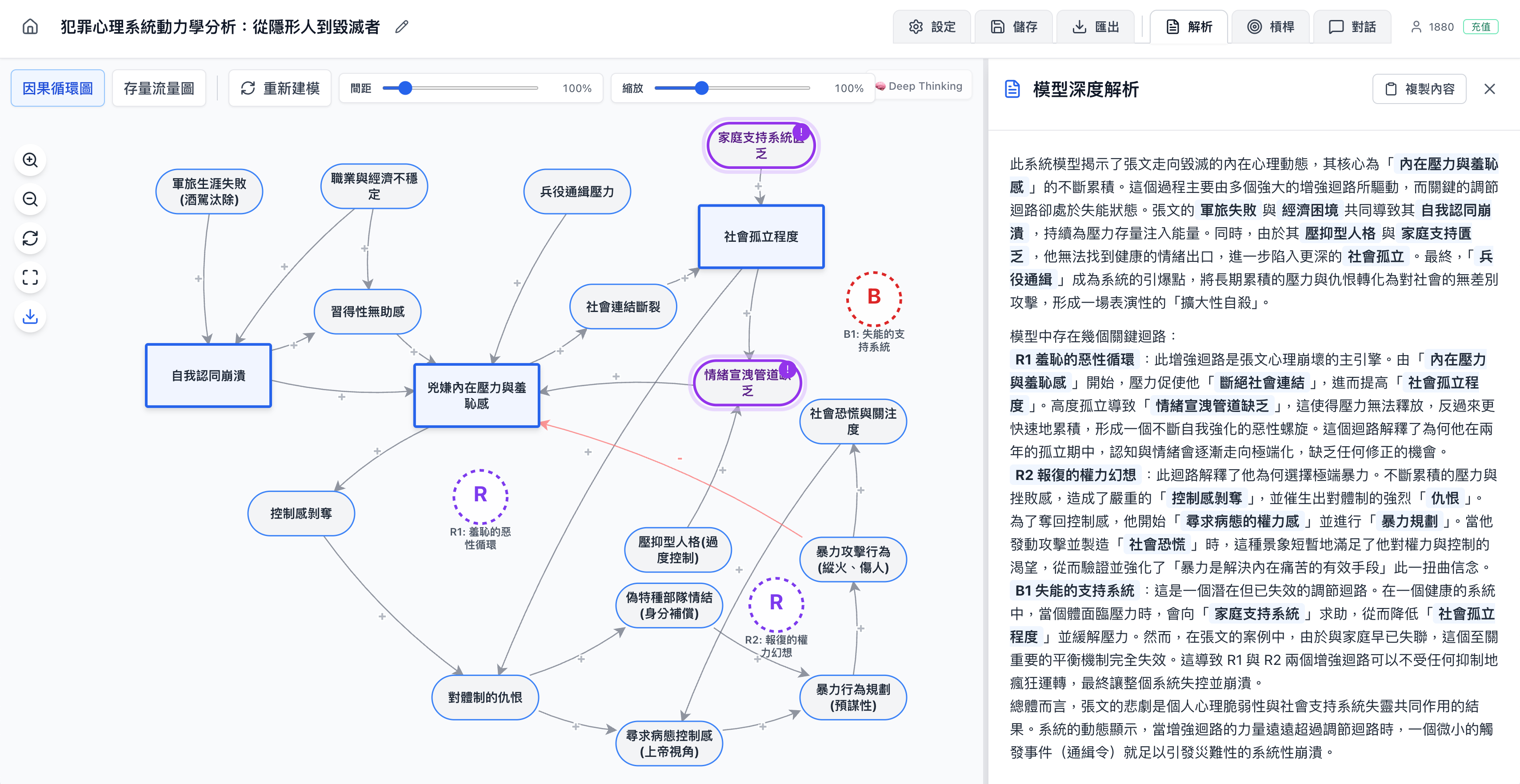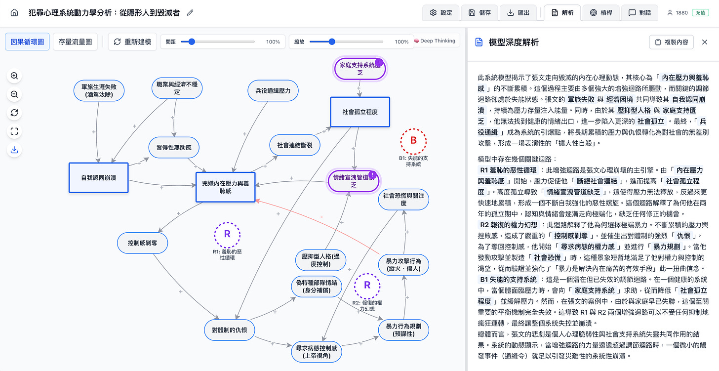 Systemaster (系統思考大師)是我們實驗室並沒有對外發表的工具,專門用於非常複雜的 “質性研究“ (Qualitative Research)的系統建模。本次,我們就以 Systemaster 透過「因果迴路圖 (CLD)」與「存量流量圖 (SFD)」兩種視角,揭示這場悲劇背後的動態真相。