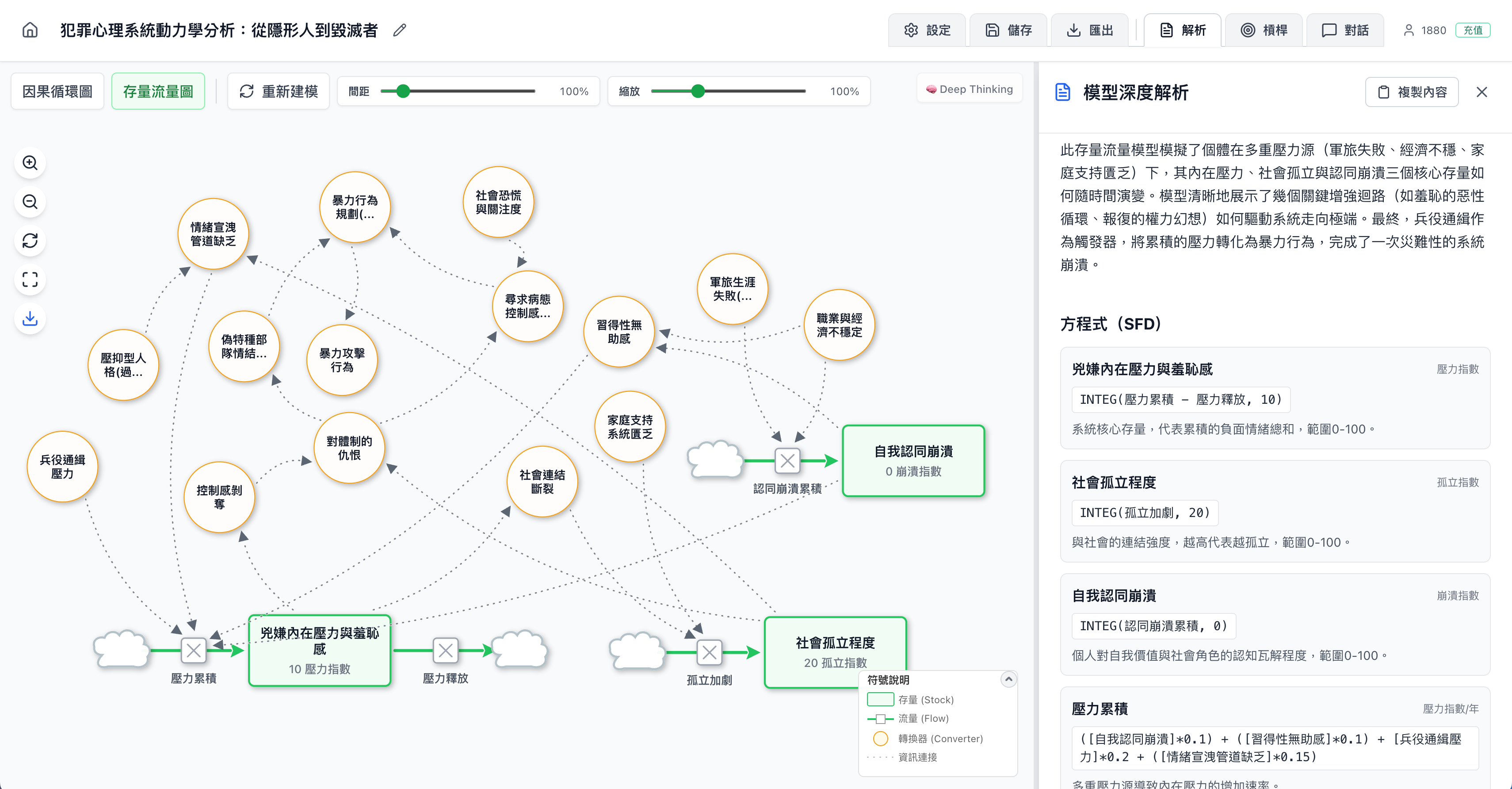 SFD 將抽象的心理狀態具象化。我們能清楚看見:當流入遠大於流出時,浴缸的水位(壓力)必然會不斷升高,最終溢出(系統崩潰)。「兵役通緝」就是壓垮駱駝的最後一根稻草,相當於有人往一個即將滿溢的浴缸裡猛然倒進了一大桶水,導致了災難性的後果。