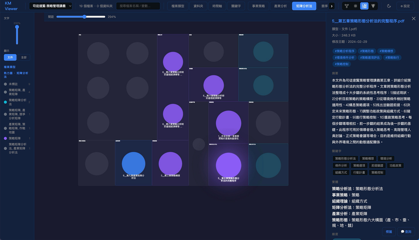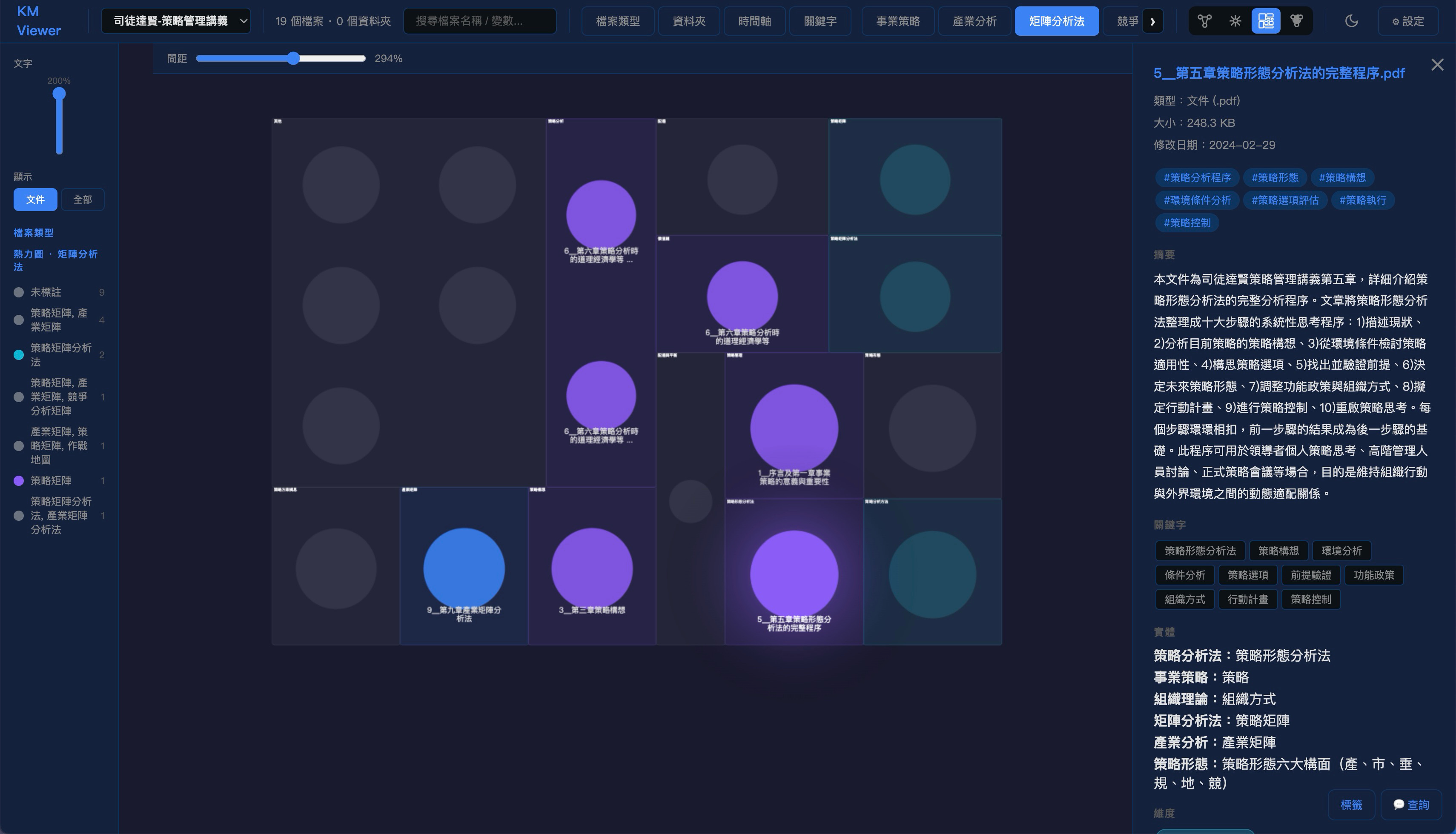 我們的版本: 打開瀏覽器就能用,手機也能連。6 種視角看同一份知識——關聯圖、心智圖、熱力方塊圖、時間軸、關鍵字群聚、因果迴路圖(CLD)。