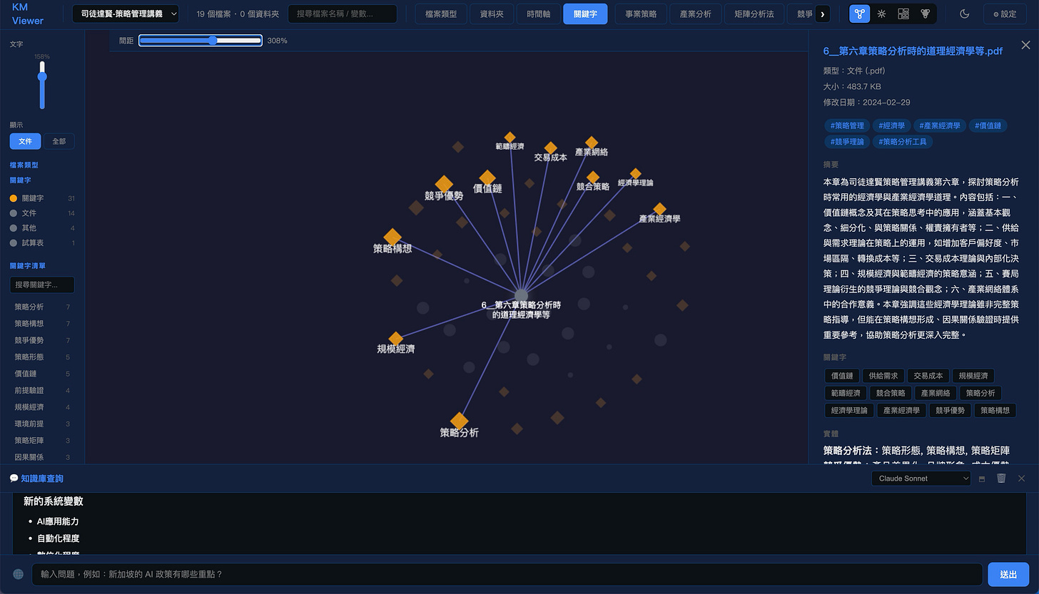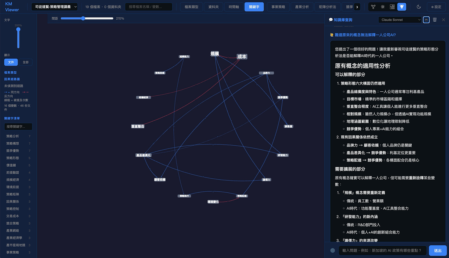 特別說一下 CLD。系統會自動從文件中歸納出變數之間的因果關係,畫成有方向、有極性的弧線箭頭。「規模 → 成本(反向)」「品牌力 → 顧客依賴(正向)」——這在策略分析和系統思考的場景下,威力巨大。